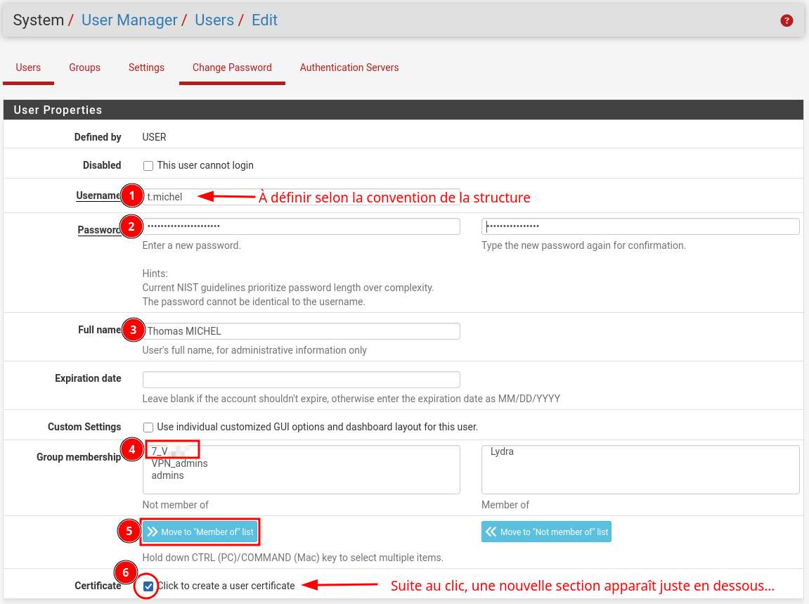 La première étape consiste à définir l’identifiant de connexion, le mot de passe, les groupes d’appartenance (cela peut donner des droits supplémentaires).