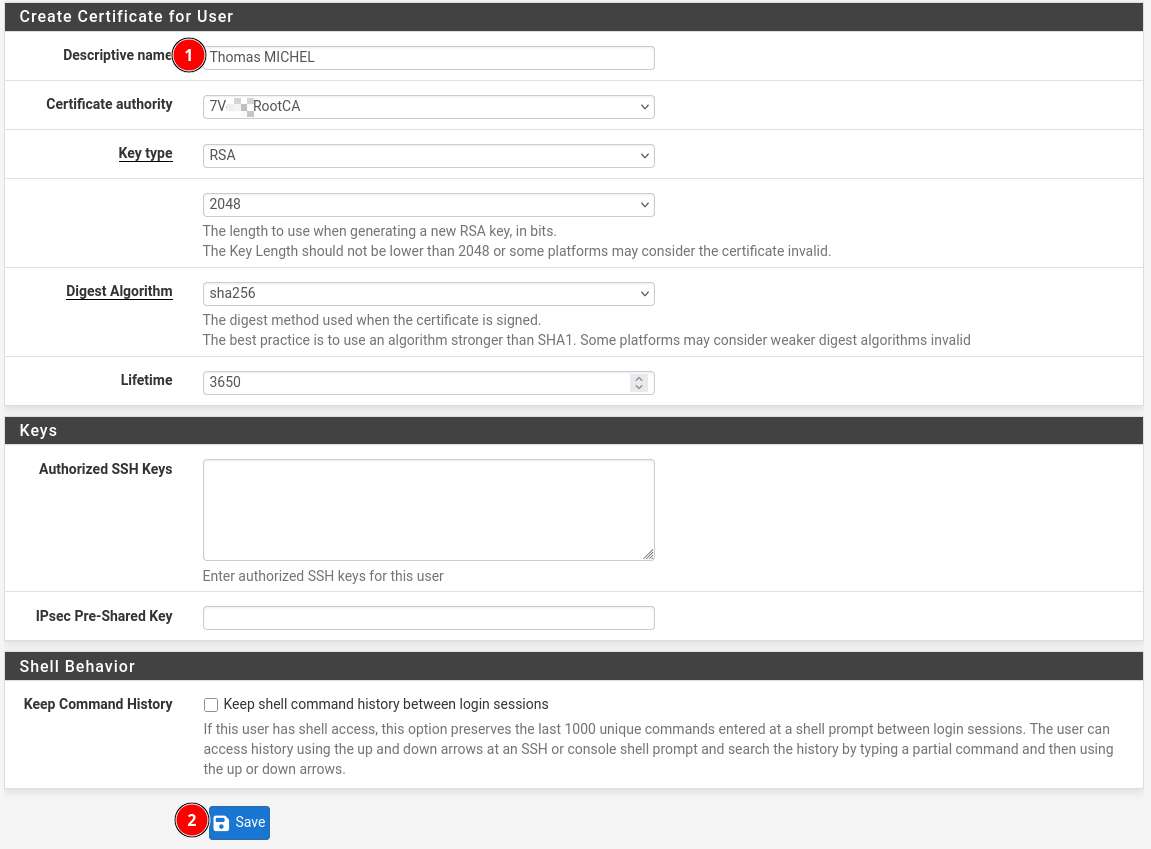 Il faut également créer un certificat utilisateur (case à cocher), car c’est nécessaire pour la connexion VPN.