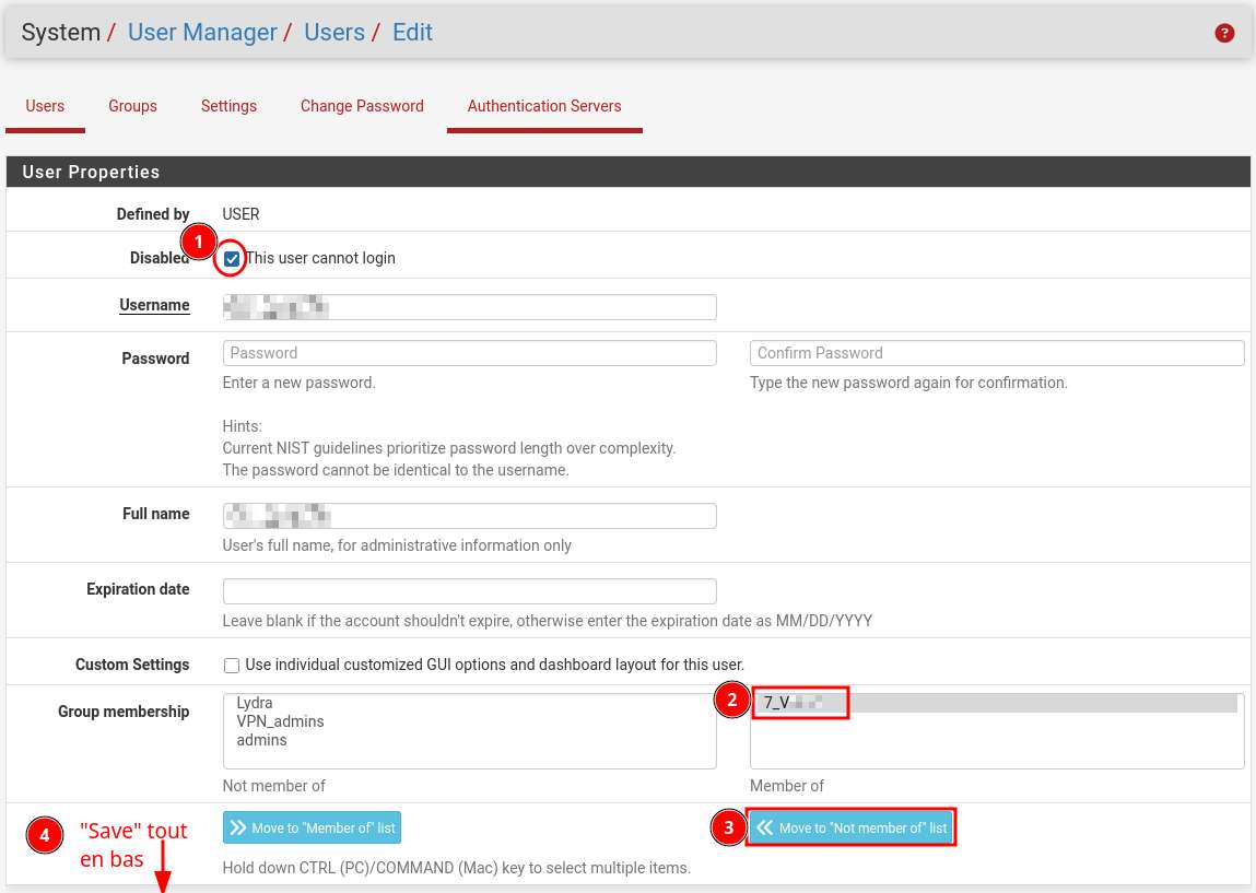 Pour désactiver un compte, il faut cocher « This user cannot login » et idéalement le retirer des groupes auxquels il appartenait.