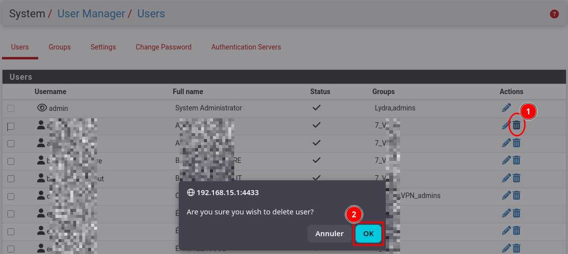 ℹ️ La suppression d’un compte est définitive. Même en recréant le compte, il ne sera pas possible de régénérer le même certificat, ce qui implique de réinstaller complètement le logiciel et sa configuration sur le poste utilisateur⋅trice.