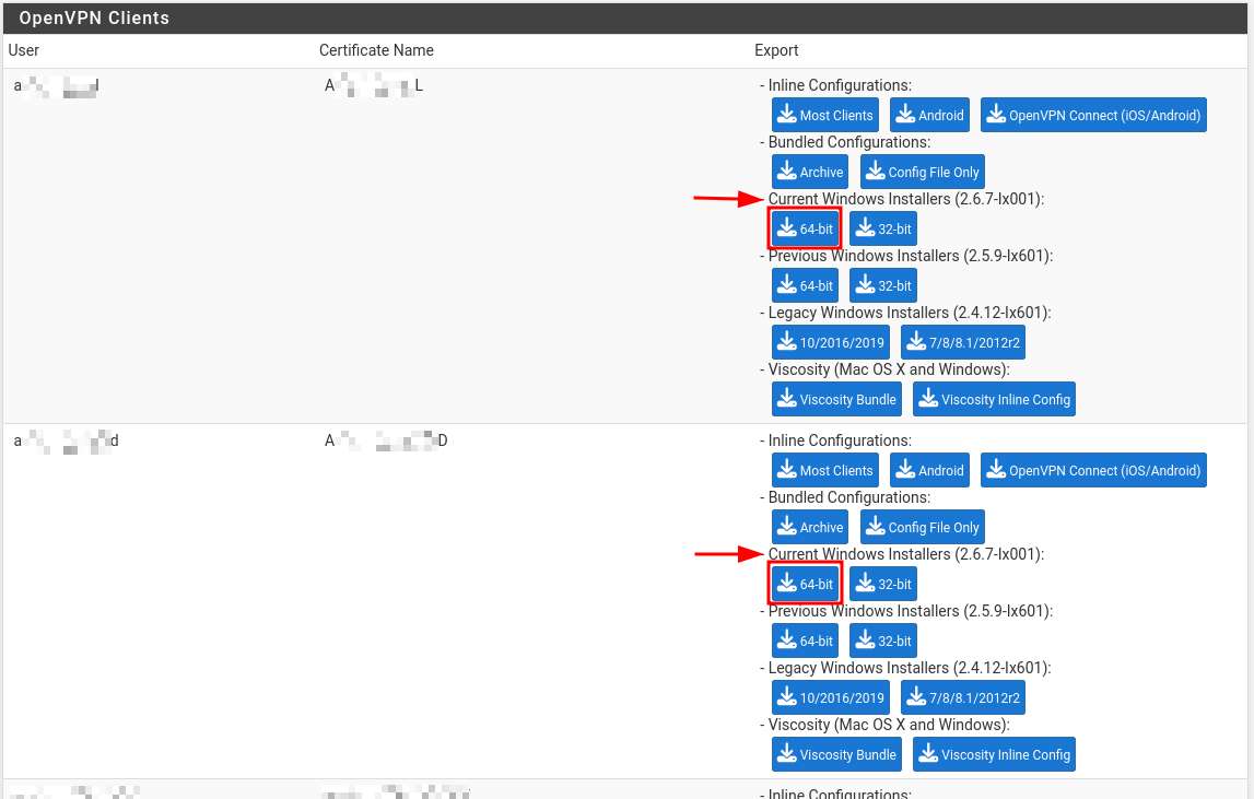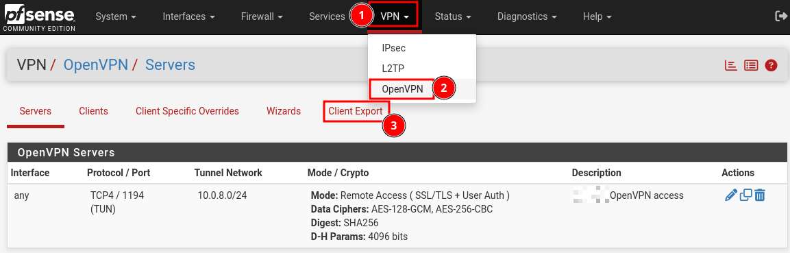 ⚠️ Il est possible de configurer manuellement avec l’installeur générique d’OpenVPN, mais nous ne le recommandons pas puisque pfSense (le Firewall) package et assure la compatibilité avec une version précise.