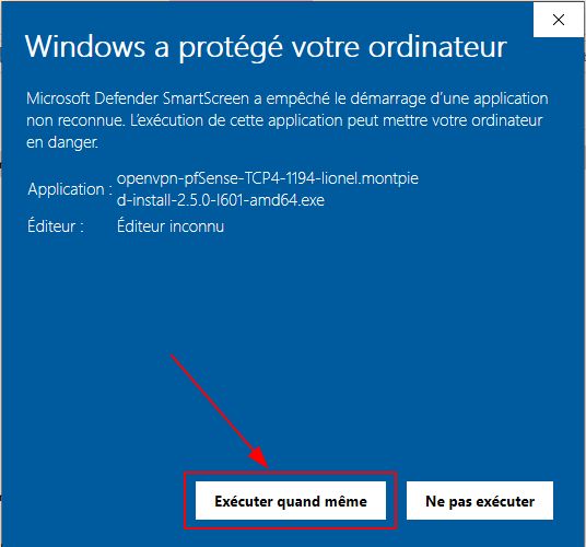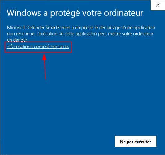 À cette étape, Windows alerte d’un risque potentiel. Continuer en cliquant « Informations complémentaires » puis « Exécuter quand même » :